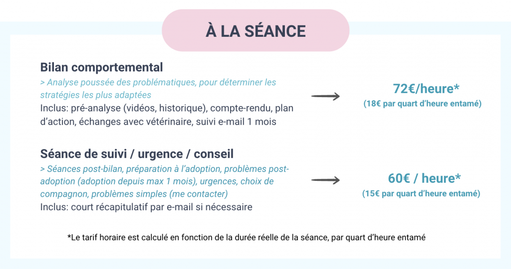 Les séances conseil / urgence sont des rendez-vous ponctuels qui ne s’inscrivent pas nécessairement dans un suivi. Elles répondent à des questions précises ou à des situations spécifiques, comme un besoin d’accompagnement dans un projet d’adoption (choix du chien, anticipation des besoins, préparation de l’arrivée à la maison).